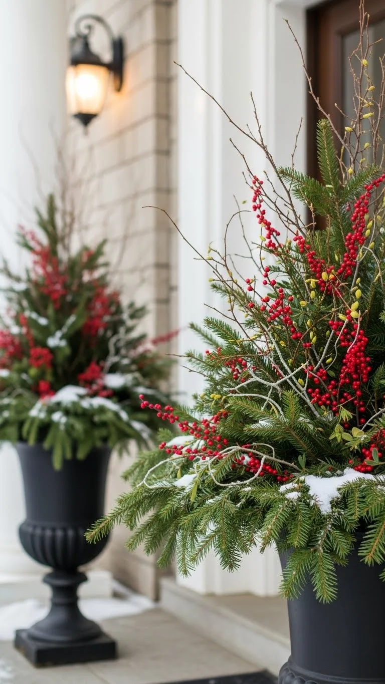 Planters offer an easy way to bring full color and texture to the porch. Fill them with evergreen branches, winter twigs, or leftover holiday clippings. Most garden stores sell bundles at low prices, but you can often gather branches from your yard. Mix short and tall pieces to create shape. To keep things natural, stick to simple accents like berries or a small bow. If your planters are empty from summer, use them again instead of buying new ones. Add soil or sand to keep branches stable. For a small porch, choose one planter and place it near the door. For a wider porch, try a pair to frame the entrance. Simple touches make these planters look full and inviting.