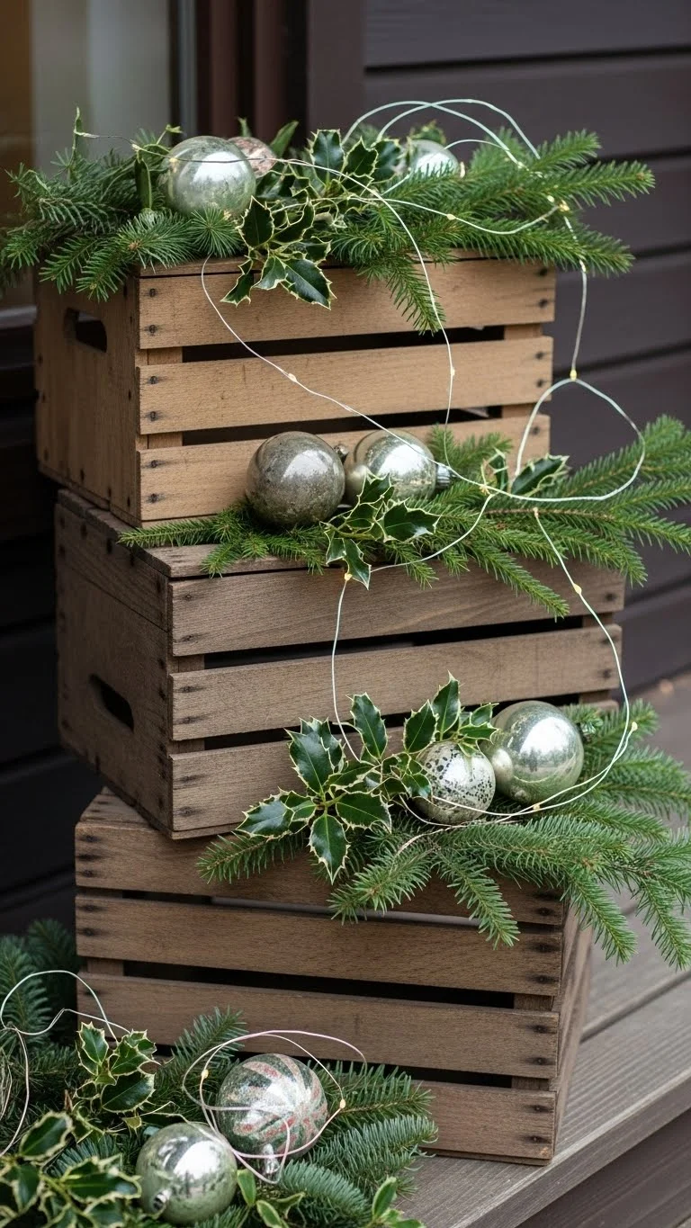 Wooden crates are an easy way to create height on your porch without complicated setups. Stack one or two crates, then fill them with small accents like ornaments, small potted evergreens, or ribbon pieces. The natural wood texture adds warmth. If you already have crates, give them a quick wipe and they’re ready to go. Even one crate can make a corner feel styled. Keep the arrangement simple so it doesn’t look cluttered. You can place a lantern inside for extra glow. Reusing items keeps costs low while still producing a cozy scene.