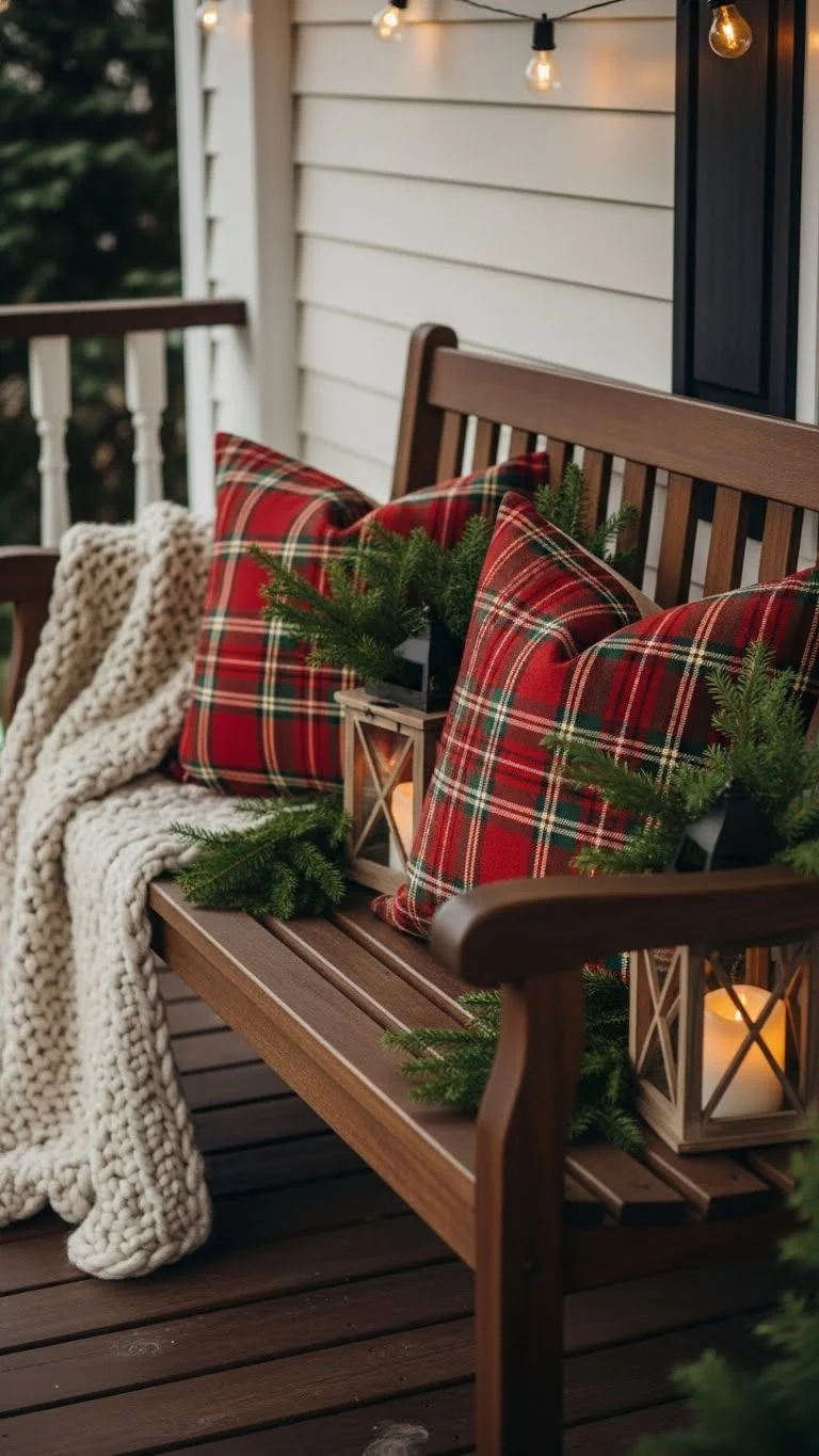 If you have a porch bench, it’s the perfect spot for festive touches. Add a plaid cushion, a thick blanket, and a few natural accents. You don’t need to buy themed pillows; neutral tones with soft patterns work just as well. Place a small basket underneath with pinecones or greenery for texture. Keep the setup simple, comfortable, and easy to maintain. If your porch bench feels bare, even one blanket can make it look inviting. This setup encourages guests to linger and makes the front of your home feel more lived-in and cheerful.