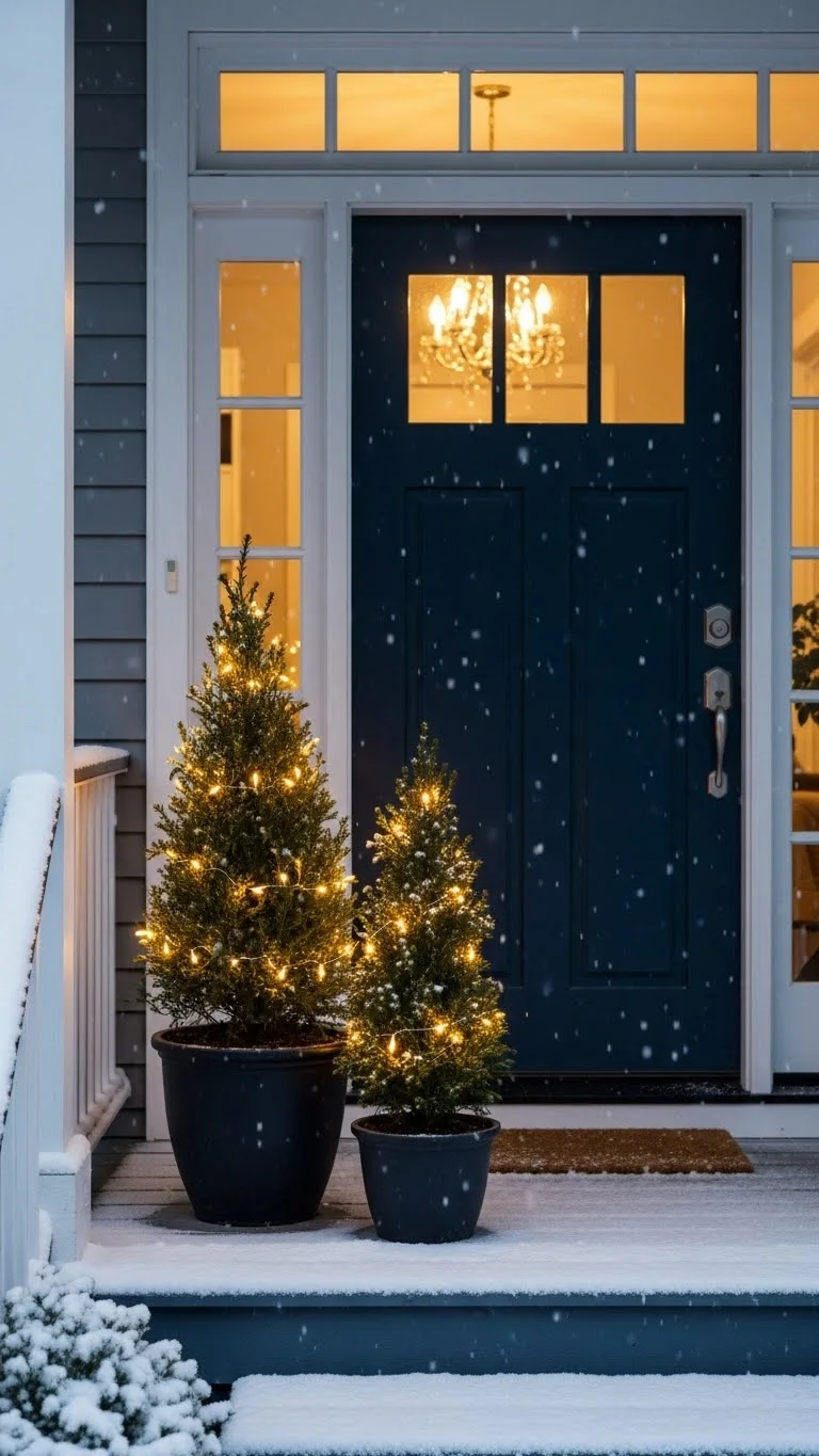 Small porch trees always feel charming. You can place one on each side of the door to create balance. Lights make them shine at night, but you can skip decorations to keep them simple. Look for real or artificial options depending on your space. Real trees bring a fresh scent and natural texture. If you’re trying to save money, you can buy small seedlings and repot them. Add a plain basket or wrap the pot in simple fabric. These small trees help fill out empty corners and bring natural winter color to your entry.