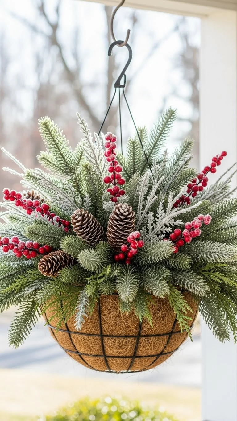 Hanging baskets aren’t just for summer. They work beautifully in winter too. Fill one with evergreens or leftover branches from trimming trees. Long pieces drape nicely and add movement to the porch. A few berries or pinecones help create contrast. This is an inexpensive option because you can reuse your existing basket. Keep the colors simple, such as green and red, to avoid overwhelming the space. Hang it near the porch light or beside the door for visibility. Even a single basket can bring life to the entry.