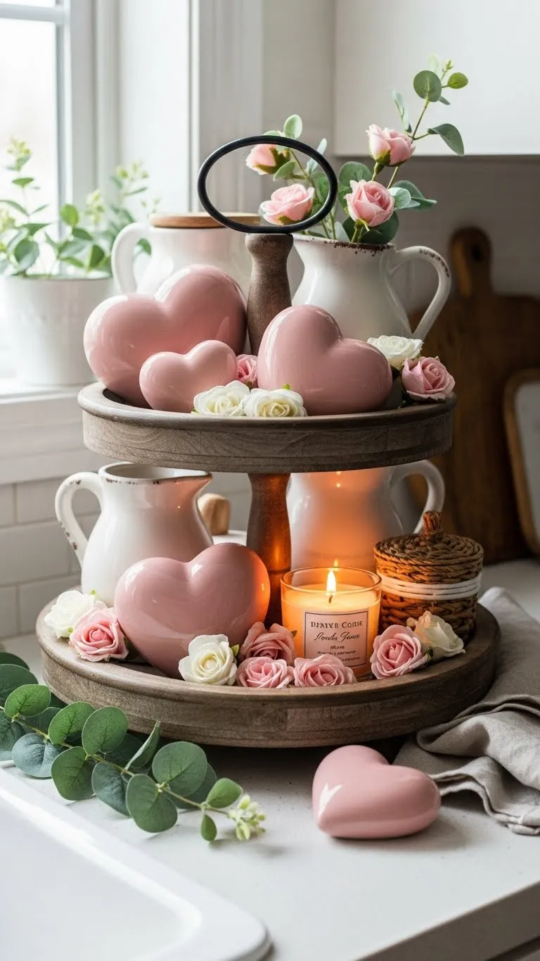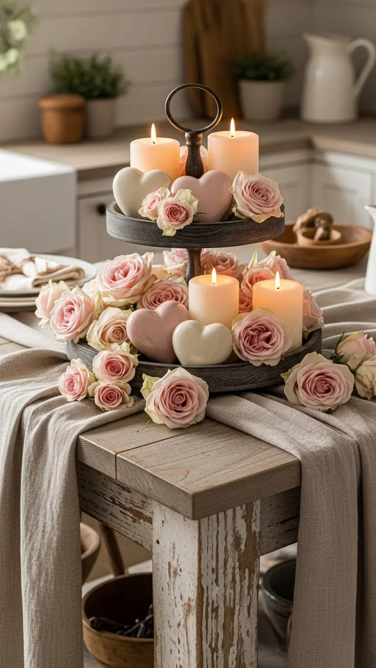 [Image Prompt] A romantic Valentine tiered tray with blush roses, neutral candles, heart-shaped ceramic decor, and soft linen textures, styled on a farmhouse kitchen island, no text on image.