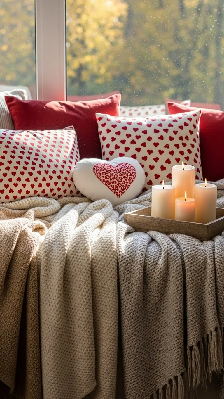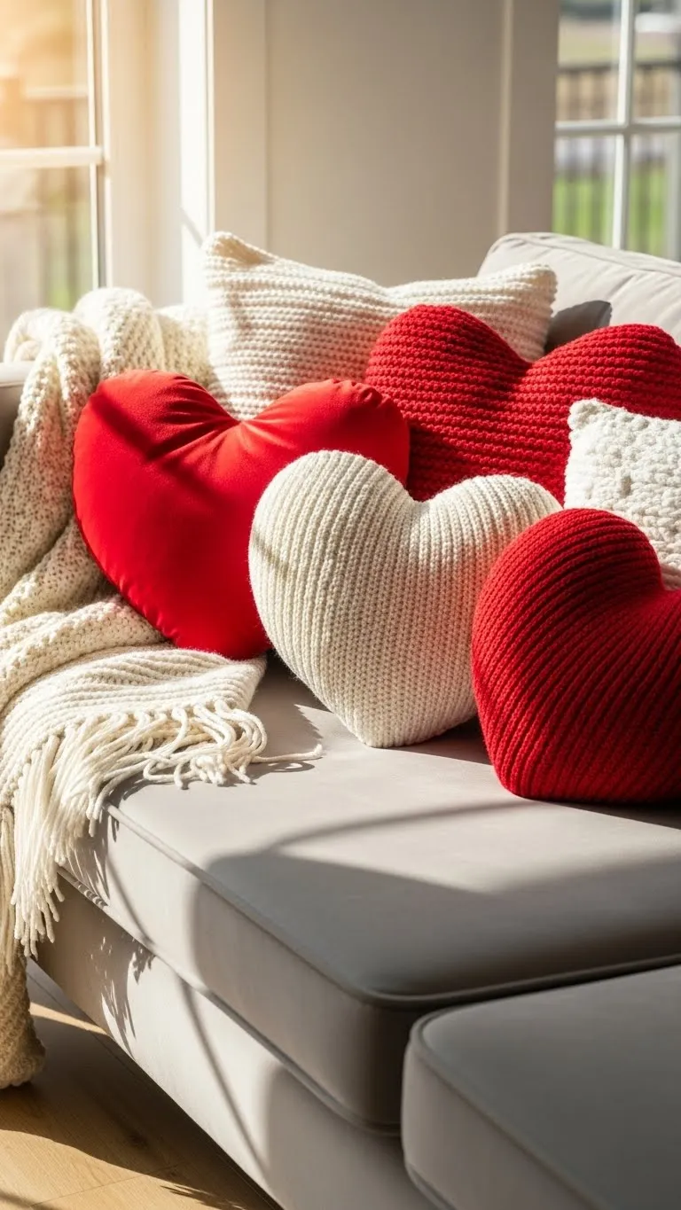 Add instant charm with heart-shaped pillows on your sofa or bed. Mix different sizes and textures—velvet, knit, or cotton—for visual interest. You can DIY some using inexpensive fabric and stuffing, or pick budget-friendly options from local stores. Arrange them casually, overlapping slightly, to create a natural, relaxed look. Pair with a neutral throw to balance bold reds and pinks. This simple addition instantly makes any seating area feel Valentine-ready.