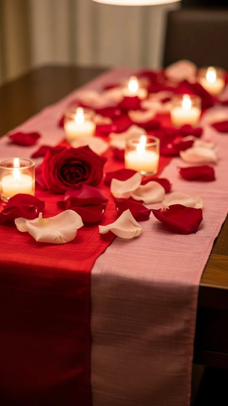 Swap your regular table runner for one in Valentine colors. Layer with candles, small vases, or scattered petals. This instantly changes the table’s vibe for dinners or gatherings. Choose a simple, affordable fabric from a craft store. Even small swaps can create a big festive impact.