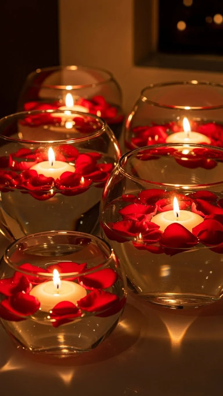 Fill clear bowls with water and add floating candles. Scatter a few petals for extra charm. Place on tables, shelves, or mantels. This adds soft light and a romantic touch without clutter. It’s an inexpensive, elegant option for small spaces.