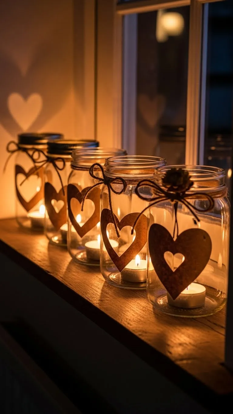 Transform mason jars into lanterns with heart cut-outs. Add tea lights inside for soft illumination. Place along windowsills, stairs, or tables. This DIY is low-cost and visually striking, creating charm with minimal effort.