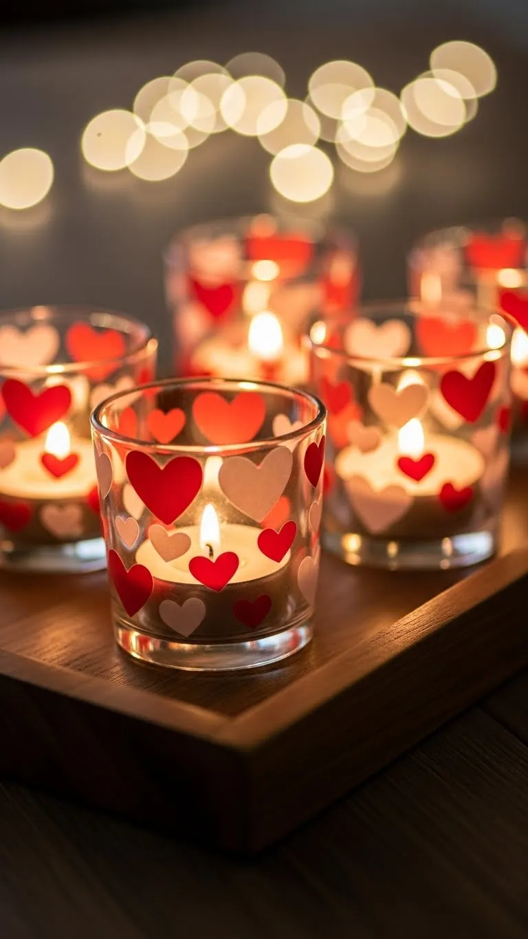 Decorate plain candle holders with cut-out hearts or paint. Add tealights and place on trays or tables. This DIY idea is inexpensive, easy, and creates a cozy glow in any room.