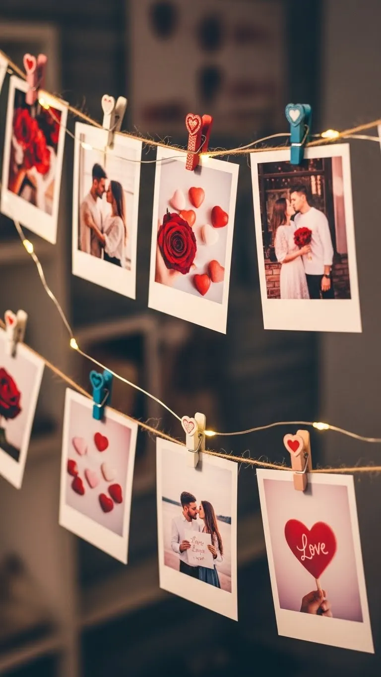 Display photos of loved ones on string or wire. Add small heart accents or lights. This creates a personal, cozy decor feature that doubles as a conversation starter.