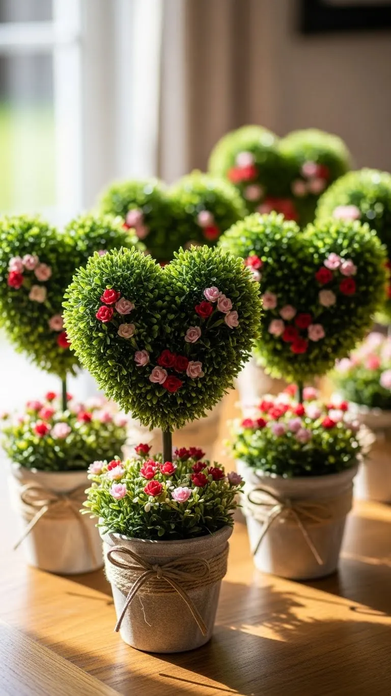 Craft or buy small heart-shaped topiaries. Place them on tables, shelves, or counters. They are cute, affordable, and instantly Valentine-themed, adding dimension and charm to any space.