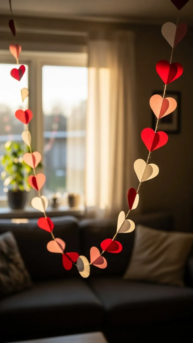 Craft your own paper heart garland using colored cardstock and string. Cut out hearts in varying sizes and attach them with tape or glue. Hang across windows, doorways, or walls. This is a fun, budget-friendly project that brings festive charm to any room. Kids can join in for extra creativity. The garland adds a playful, personalized touch without taking up space or breaking the bank.
