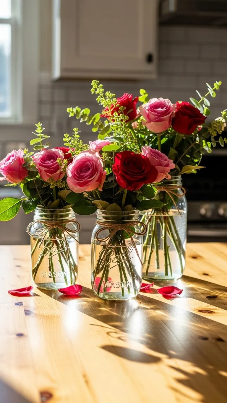 Transform ordinary mason jars into romantic vases. Fill with fresh flowers, faux stems, or seasonal greenery. Wrap the jars with twine, ribbon, or lace for added texture. Place them on tables, shelves, or bedside tables for a subtle Valentine accent. Using multiple jars of different sizes creates visual variety and a cozy, homey feel. This idea is low-cost but highly effective for spreading warmth throughout your space.