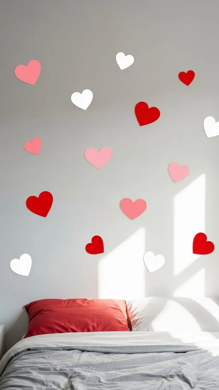 Use removable heart decals to create a quick, fuss-free decoration. They’re easy to apply and remove, making them perfect for renters or temporary setups. Arrange them in clusters, patterns, or a random scatter. Pair with a neutral wall color for a clean, cheerful contrast. This adds instant visual interest without permanent commitment.