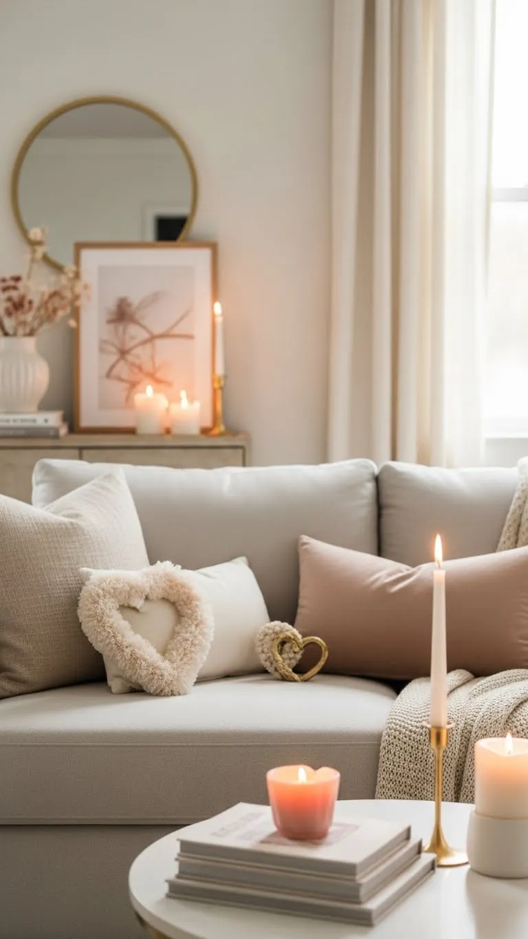 A soft neutral palette sets the tone for a refined Valentine look. Think beige, cream, blush, and light gray. These shades feel calm and timeless. They also work well with items you already own. Start by swapping bright décor for softer pieces. Pillow covers are an easy place to begin. Neutral throws also help change the mood fast. You can layer shades instead of using one flat color. This adds depth without clutter. Use different textures like linen, cotton, or knit. Texture keeps the space from feeling plain. If your room already has color, tone it down with neutral accents. A cream tray or light ceramic vase can balance bold furniture.