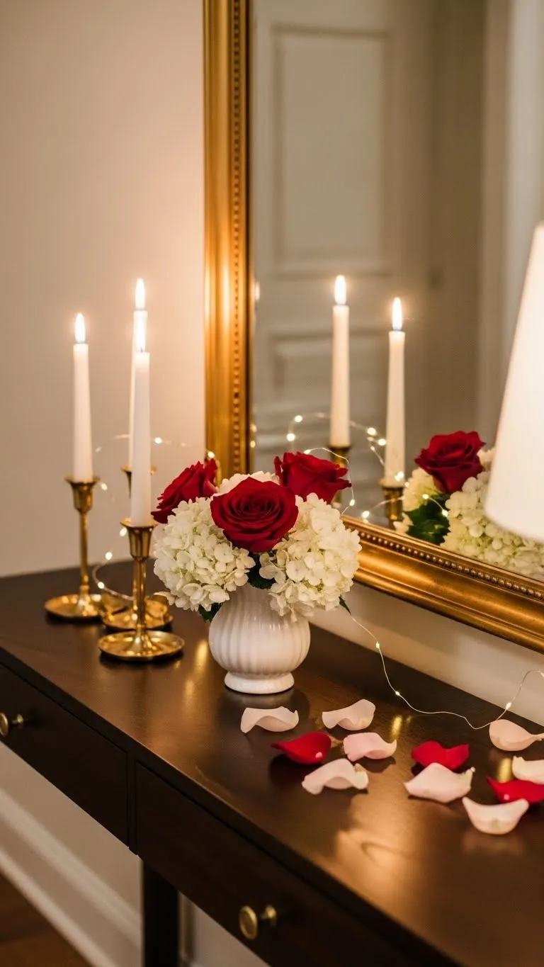 The entryway sets the mood. Style your console with a few Valentine touches. Use a mirror, a small vase, and candles. Keep spacing open. Choose items you already own. Rearranging can make them feel new. Add a heart accent or soft florals for the season. Budget tip: Move décor from other rooms. DIY idea: Frame a simple print in neutral tones. A styled entryway welcomes guests with warmth and grace.
