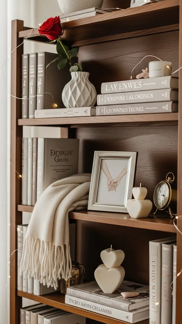 Bookshelves hold more than books. Add small décor pieces. Use hearts, candles, or frames. Leave empty space. This keeps shelves from feeling heavy. Budget tip: Rearrange items you own. DIY: Wrap books in neutral paper. Simple changes make shelves feel special.