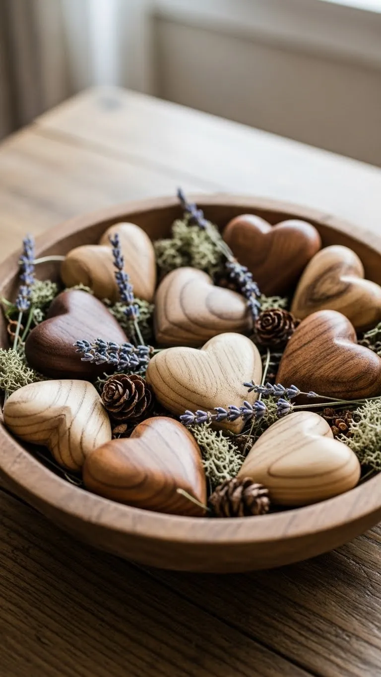 Use a wooden bowl you already own. Fill it with small wooden hearts, beads, or pinecones. Keep colors neutral. This makes a quick Valentine accent. Place it on a table or shelf. When the season ends, swap fillers for everyday decor. Wooden fillers are reusable and affordable.