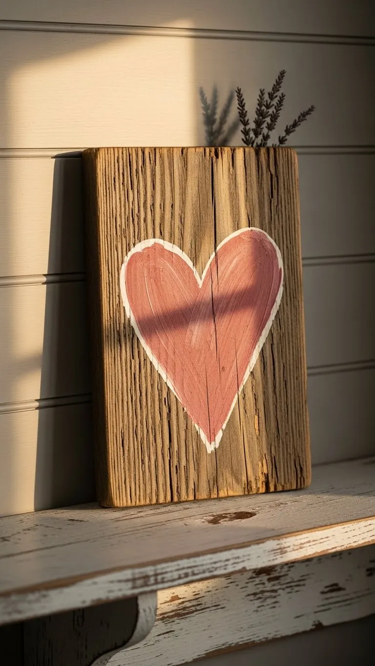 Create a simple sign from scrap wood. Paint a single heart in a muted tone. Leave brush strokes visible. This adds character. Lean it on a shelf or hang it with twine. You do not need words for impact. This keeps the decor calm and timeless.