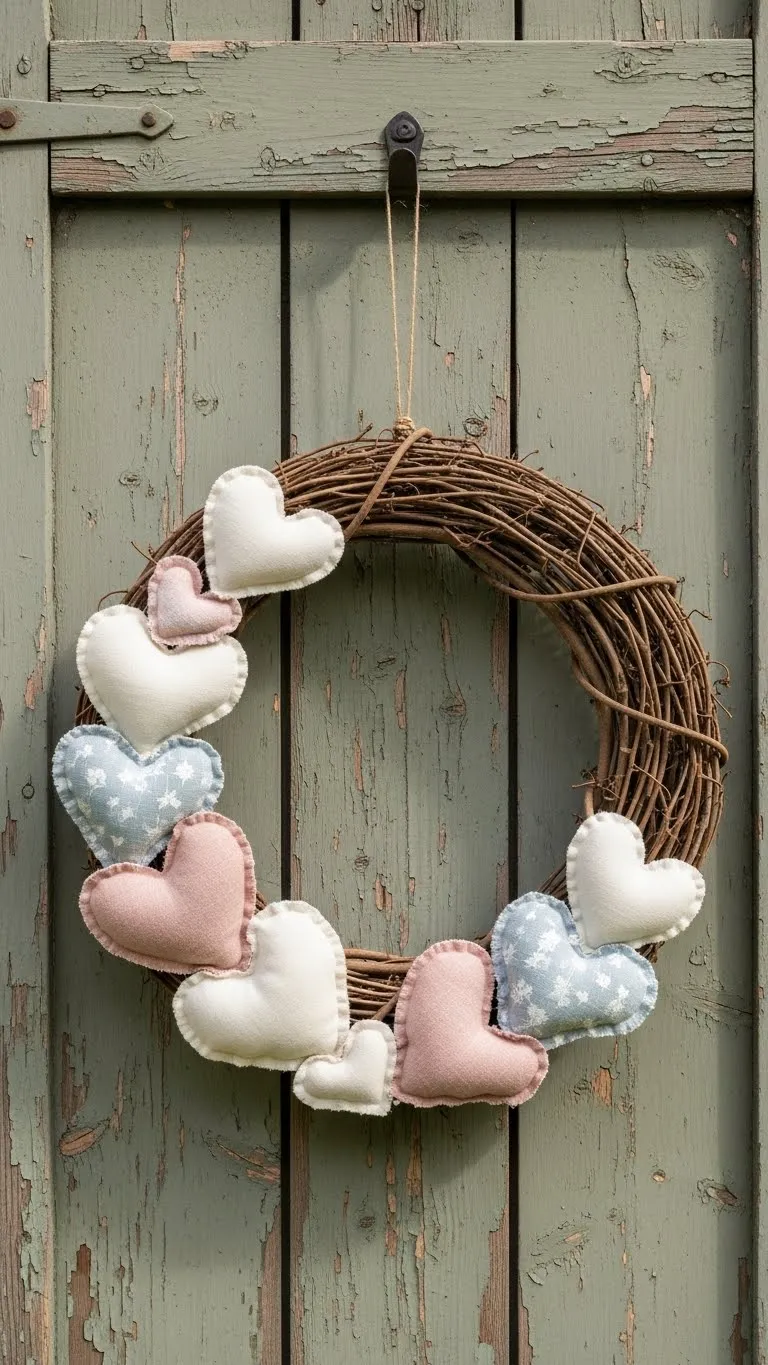 Grapevine wreaths work well for farmhouse homes. Add fabric hearts or ribbon. Keep colors soft. Hang it on a door or wall. You can reuse the base year after year. Swap decorations easily. Craft stores often sell grapevine wreaths at low prices.