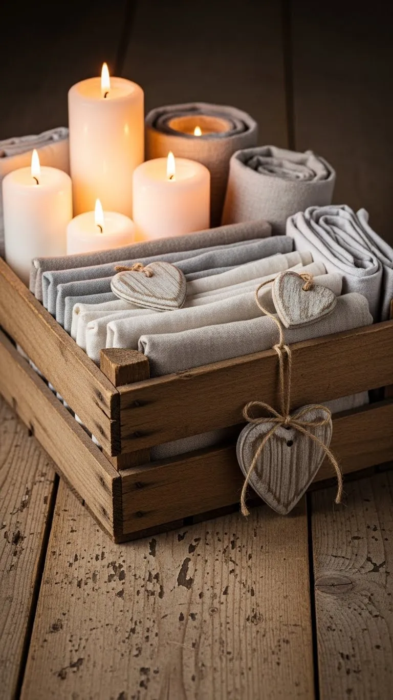 Wooden crates add storage and style. Use one as a decor base. Add candles, books, or folded fabric. Include one or two heart items. Avoid filling it too much. This works in corners or next to sofas. Old crates can be found cheaply or repurposed.