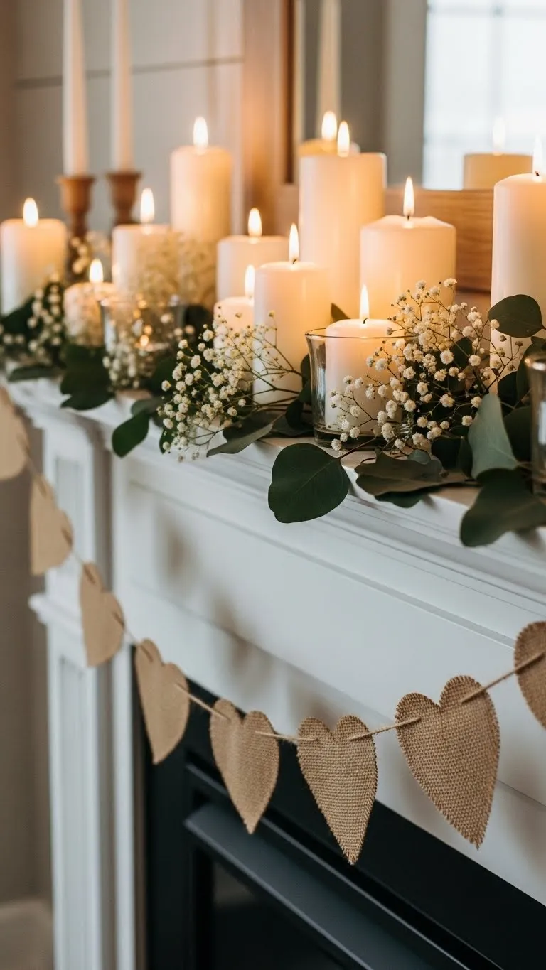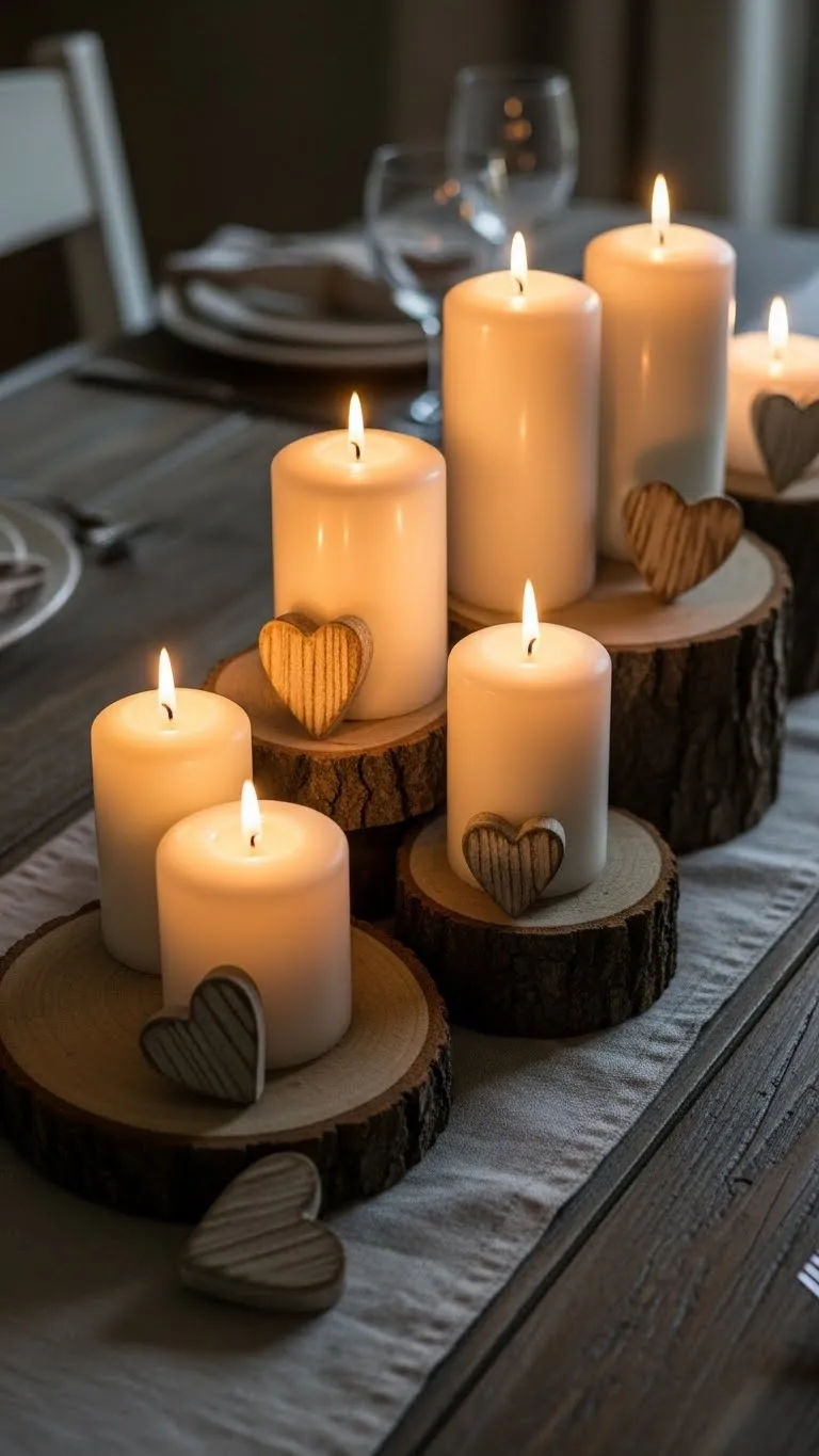 Candles always add comfort. Group them on wood slices or a tray. Add small heart decor nearby. Keep heights varied. This centerpiece works for dinners or everyday use. Battery candles are safe and reusable. Wood slices can be found at craft stores or cut from branches.