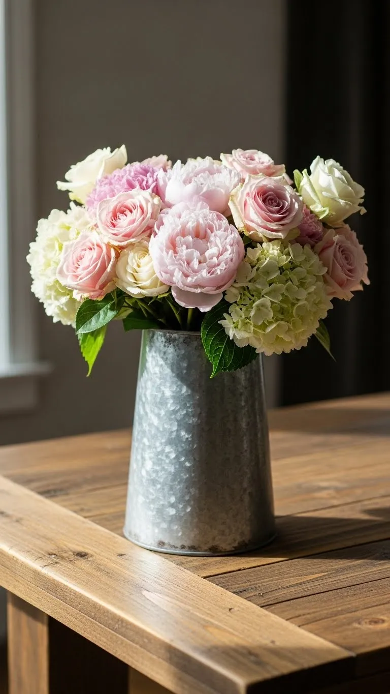 2. Galvanized Metal Vase With Soft Florals