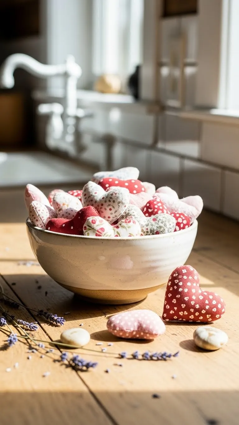 Fabric hearts soften kitchens easily. Sew or cut simple shapes. Fill a ceramic bowl. Use neutral fabrics. Place it on the counter or island. This adds Valentine charm without taking space. Fabric scraps work well for this project.