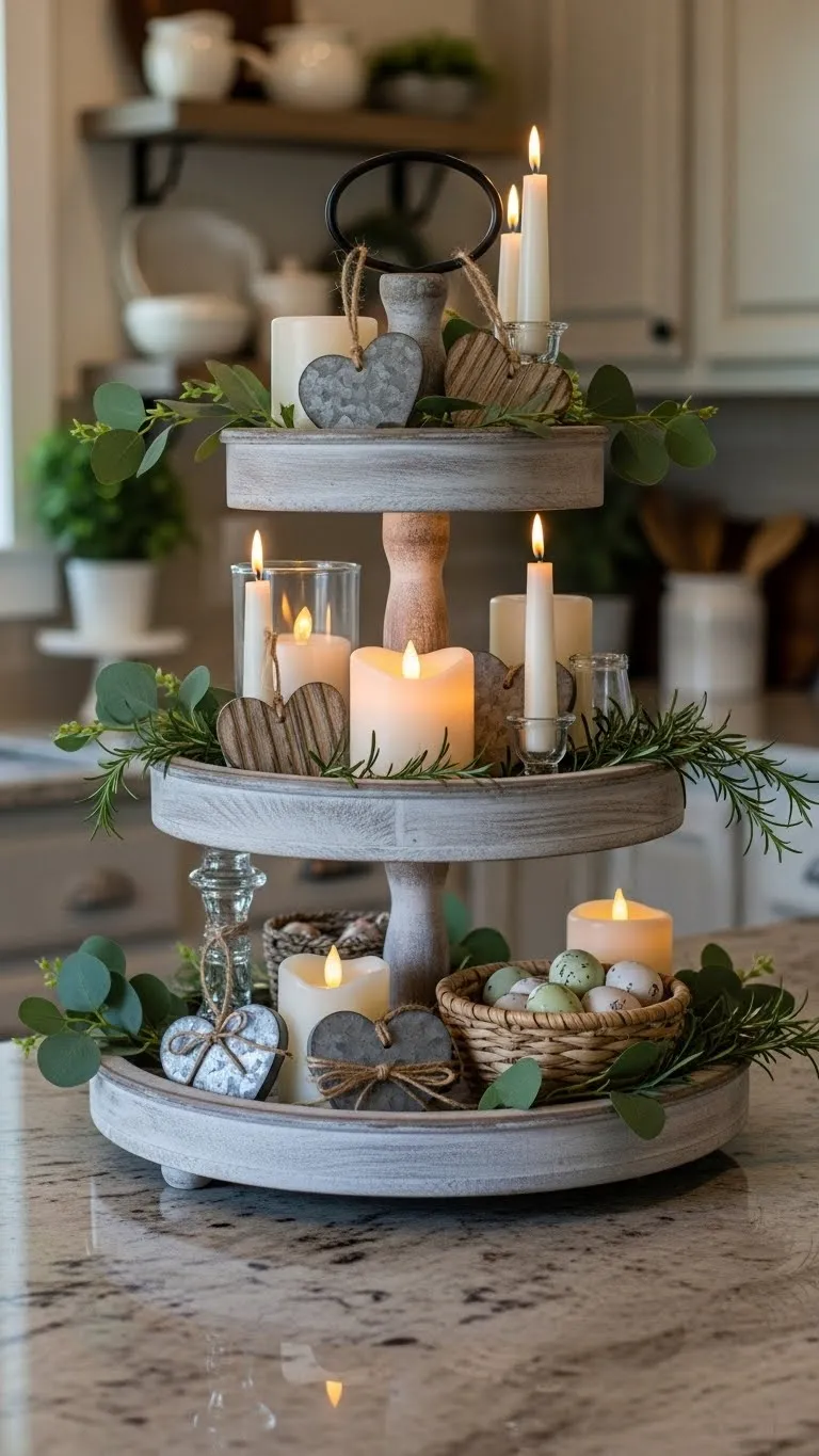Tiered trays help organize decor. Use small items only. Add one or two heart accents. Mix in wood and ceramic pieces. Avoid filling every spot. This keeps it balanced. Trays can be reused for many seasons.