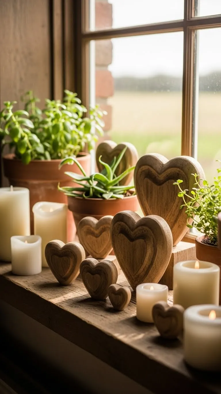 Window sills are often overlooked. Add small decor pieces. Wooden hearts and plants work well. Keep heights low. Natural light makes everything feel cozy. This decor feels calm and simple.