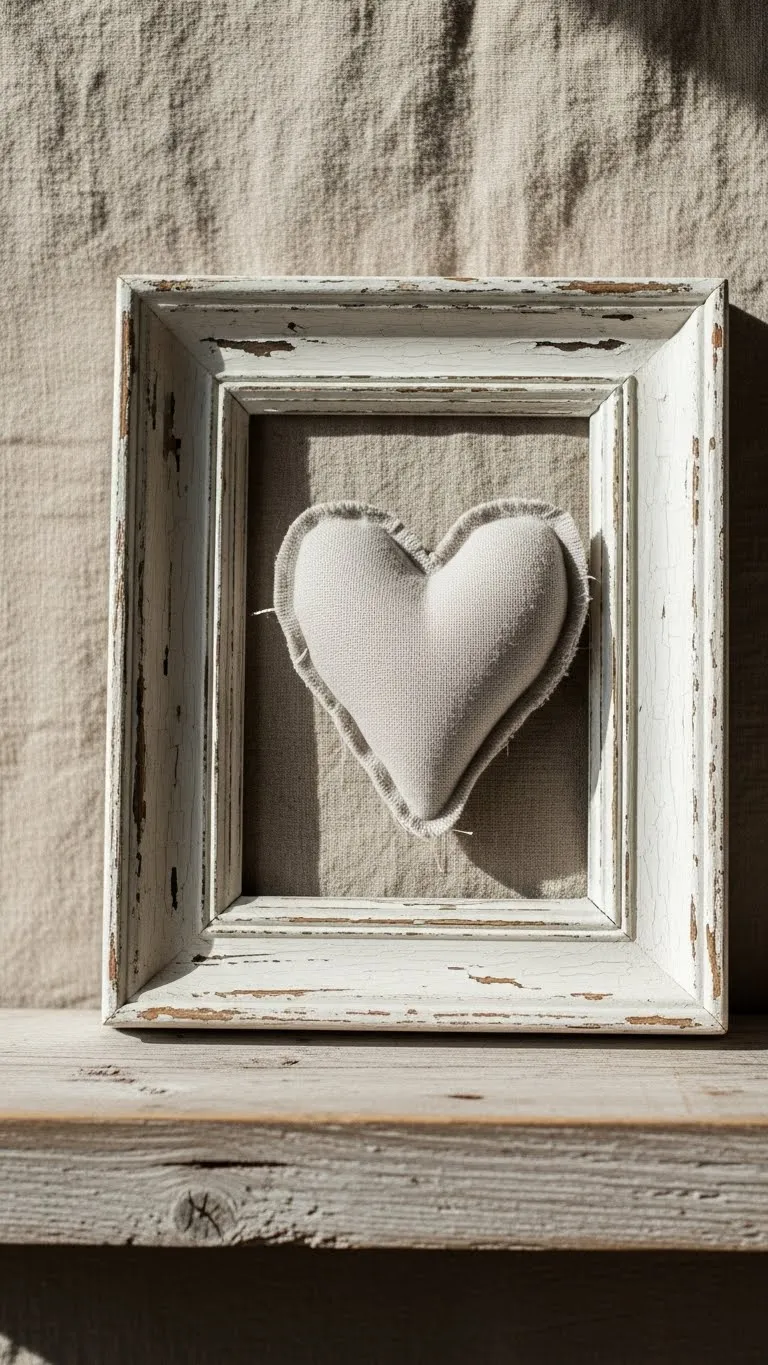 Old frames work well for seasonal decor. Remove the glass and backing. Add a fabric heart cut from linen or cotton. Attach it to a neutral background. Light stains or paint distressing help it blend in. Lean the frame on a shelf or mantel. Thrift stores offer frames in many sizes. This idea feels personal without being busy.