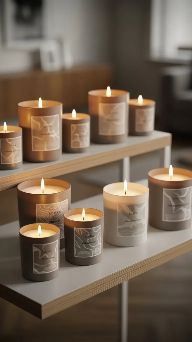 Choose candles with plain jars. Soft rose or vanilla scents work well. Budget tip: Transfer candles into plain glass containers. Group candles in odd numbers for balance.