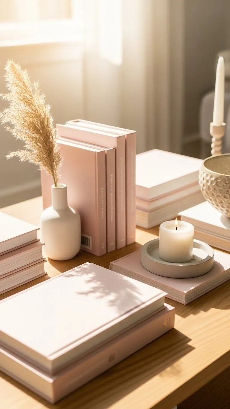 Books add color naturally. Stack two or three. Budget tip: Use dust jackets or covers. Avoid busy titles.