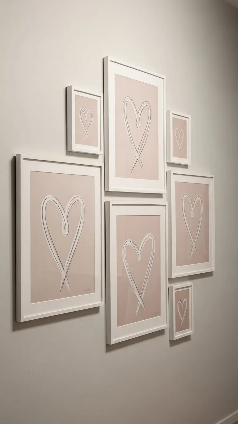 Heart art does not have to look playful or bold. Line drawings or abstract heart shapes feel calm and stylish. Use thin black, beige, or wood frames. Hang one large piece or a pair side by side. Budget tip: Print digital art on matte paper. Frame with simple frames from discount stores. You can also draw a heart outline yourself using pencil or ink. Keep spacing balanced. Avoid crowded gallery walls. This approach adds Valentine charm without changing the room’s style.