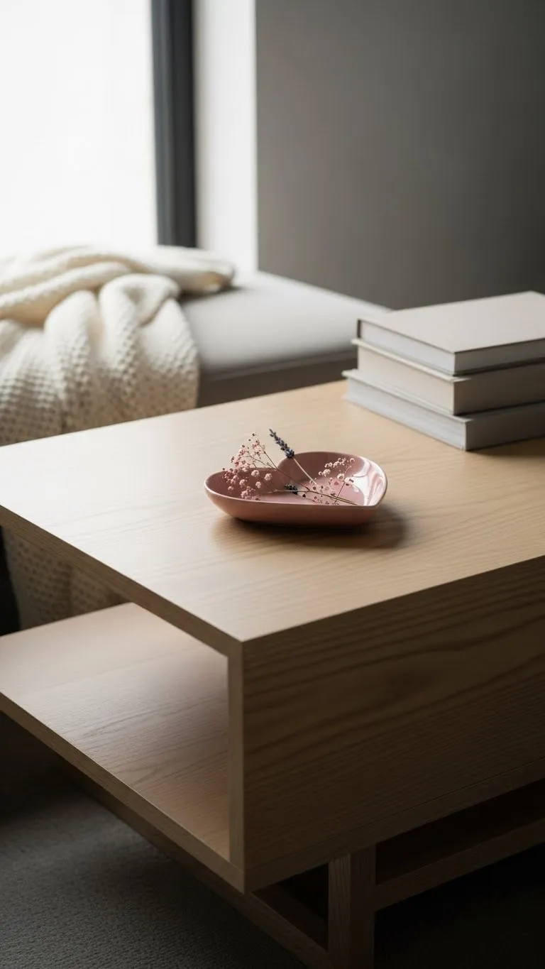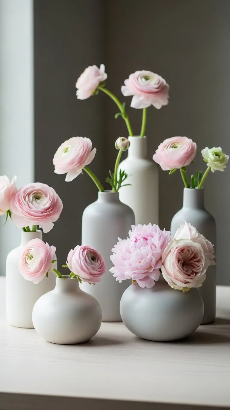 Matte ceramic vases feel calm and modern. Choose white, beige, or soft gray. Add pale pink flowers or dried stems. One vase on a table makes enough impact. Budget tip: Use faux stems from craft stores or trim real flowers short. Grocery store flowers work well here. Keep arrangements loose. Avoid large bouquets. This keeps the look simple and easy to maintain.