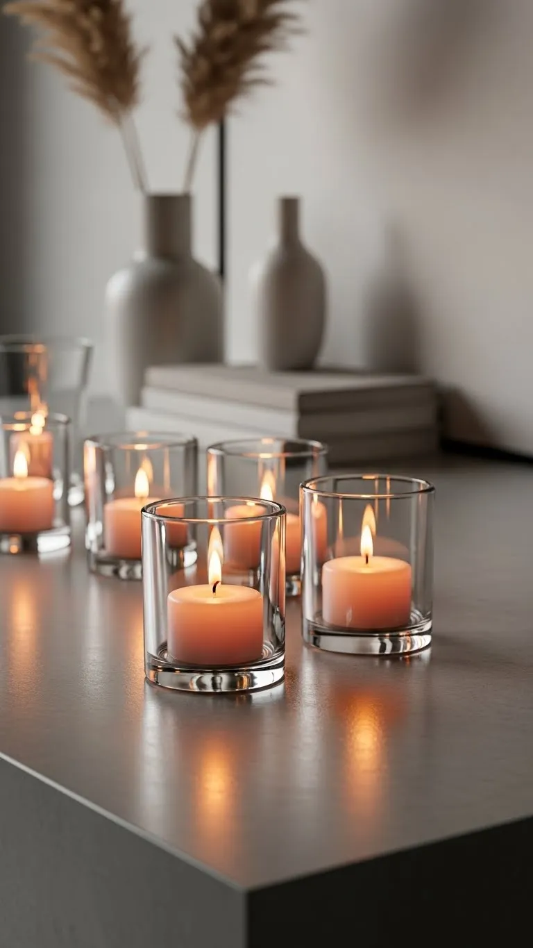 Clear glass keeps things light and modern. Use warm white candles for a soft glow. Place them in small groups of three. Budget tip: Use LED candles if open flames are not allowed. Dollar stores often carry glass holders. Avoid colored glass. This keeps the look clean and calm.