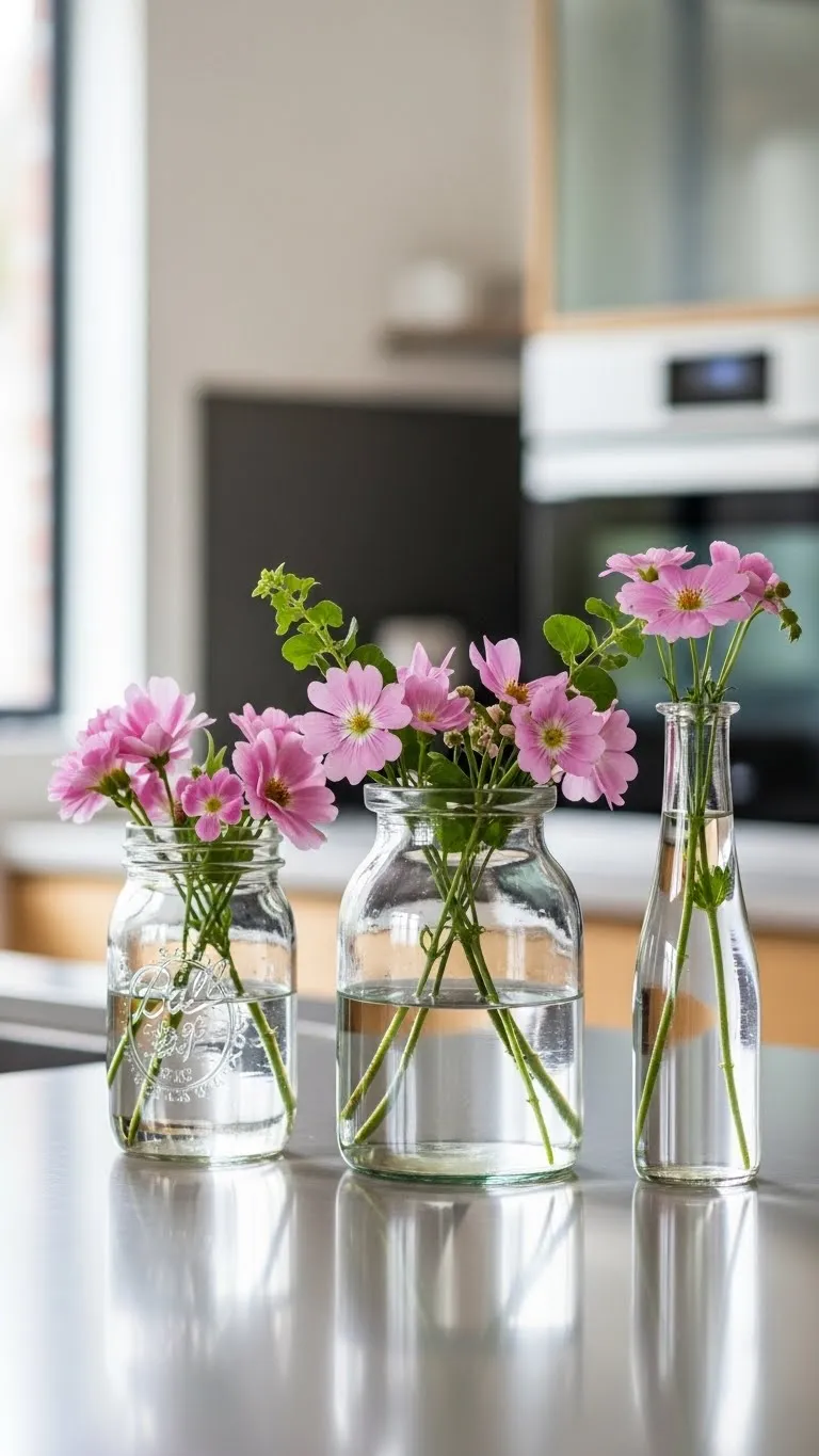 Glass jars feel casual yet stylish. Use a single flower or small stem per jar. Place them on counters or shelves. Budget tip: Reuse jars from candles or food containers. This works well in kitchens and bathrooms where space is limited.