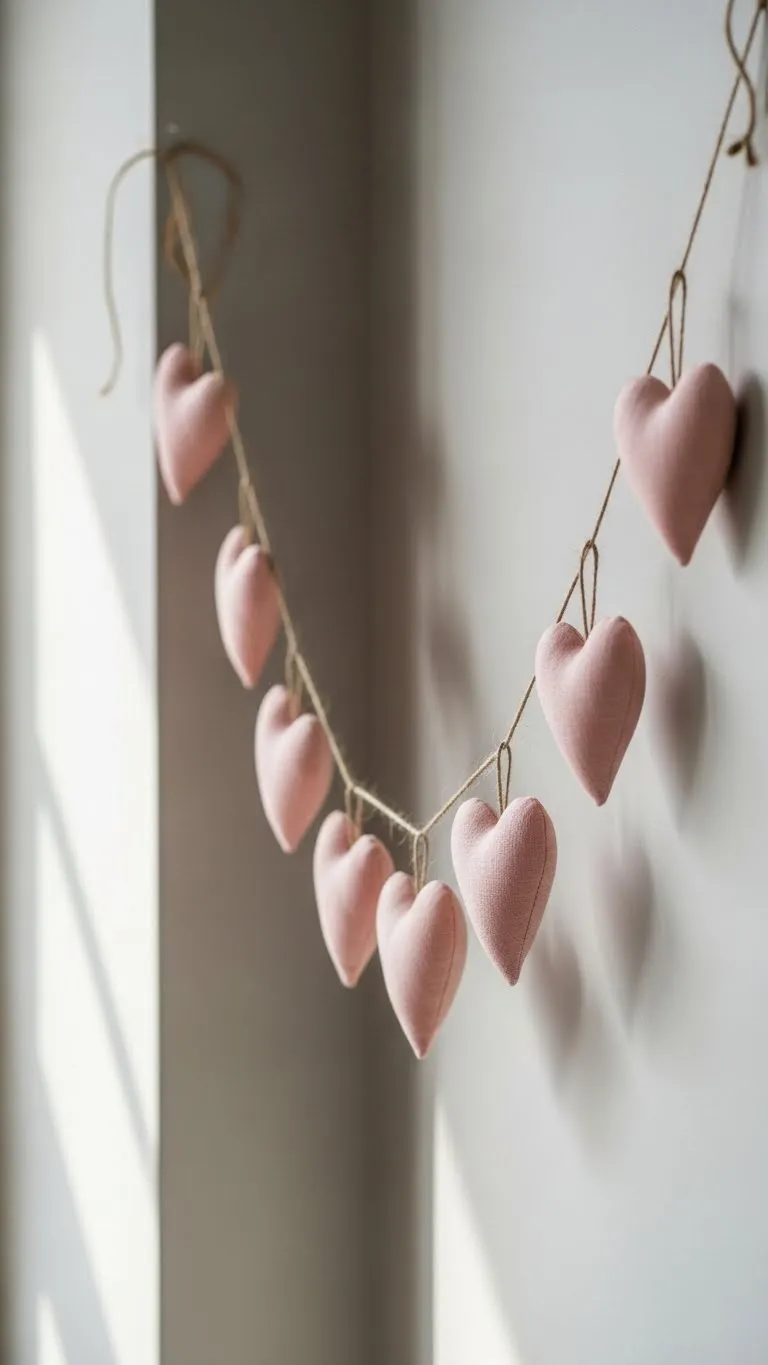 Fabric hearts feel softer than paper. Keep shapes simple. Hang across a shelf or mirror. Budget tip: Cut hearts from scrap fabric and string with twine. Limit the length to avoid clutter.