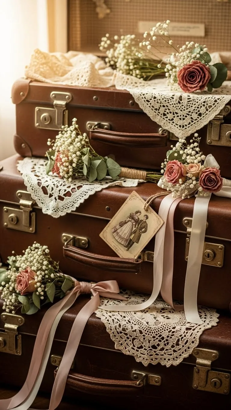 Old suitcases add height. Stack them near sofas or beds. Use the top as a display surface. Add lace or candles on top. Suitcases also store décor inside, making them practical and decorative.