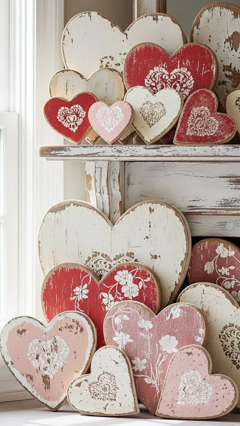 Wooden heart signs add warmth. Use scrap wood cut into simple shapes. Paint hearts in muted pinks or creams. Sand edges lightly for wear. Lean signs against walls or frames rather than hanging them. This feels relaxed and easy. Stack different sizes for depth. When Valentine’s Day passes, flip them around or store flat.