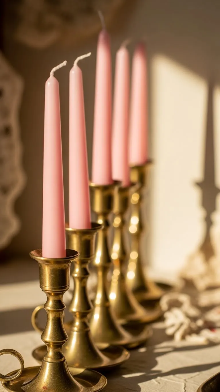 Brass candle holders add warmth. Slight tarnish adds character. Pair with soft pink or cream tapers. Group holders in odd numbers. Keep heights varied. This works well on mantels or dining tables. Brass pieces can be cleaned lightly or left worn for charm.