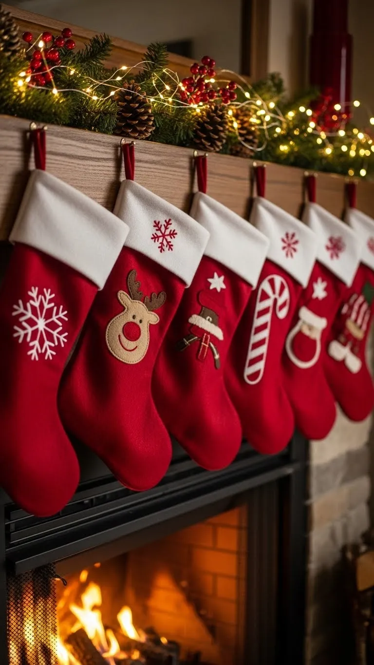 Classic red stockings look timeless and cozy. Hang them on a mantel or wall hooks. Choose wool or knit textures for old-style charm. Thrift stores often carry low-cost options. Add patches or ribbon for a personal DIY touch. Place a bit of greenery inside each stocking for extra texture. These stockings work well with soft lighting and calm colors. They give your space a warm holiday feel that families love.