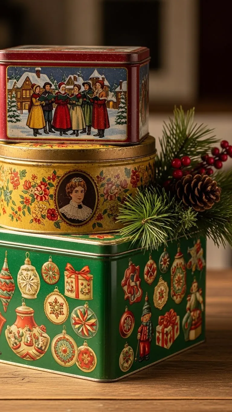 Vintage cookie tins add charm with their colorful prints. Place them on shelves, kitchen counters, or under the tree. You can find them cheap at thrift stores. Clean them with a soft cloth to keep their artwork bright. Fill them with candy or baked goods. A DIY tip is stacking tins to create small decor towers. Add ribbon between each layer for balance. These tins add warmth to your kitchen or dining area.