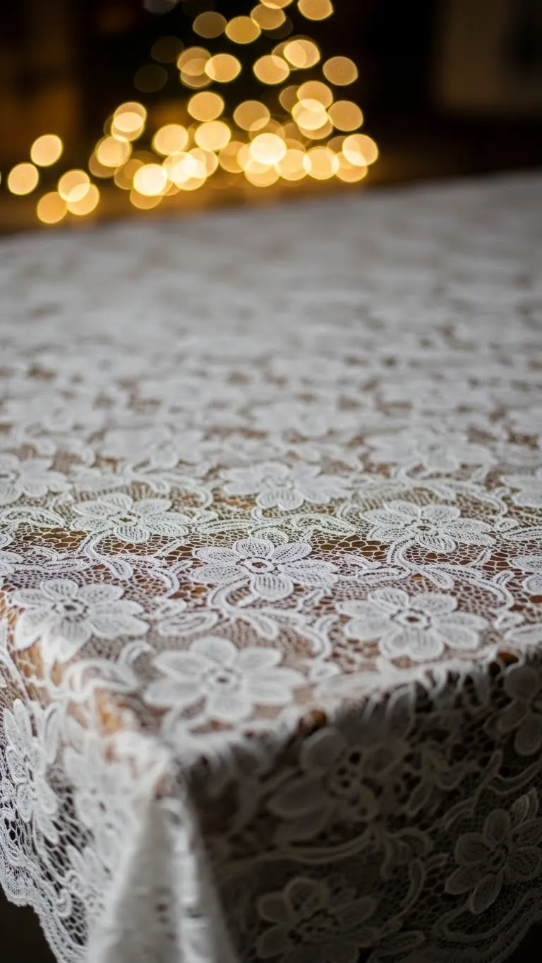 Lace tablecloths add softness to your holiday setup. Their patterns bring a gentle old-style charm. Spread one on your dining or coffee table. You can buy them cheaply at consignment shops. Layer them over a solid cloth for contrast. Add candles, pine branches, or simple dishes for a soft centerpiece. A DIY idea is trimming extra lace to make napkin wraps. These cloths help your space feel warm and welcoming.