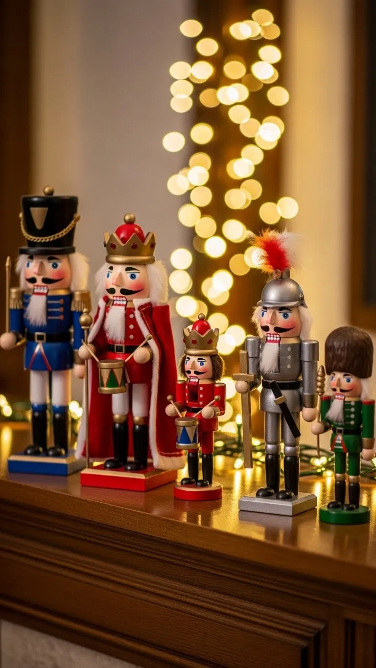 Classic nutcrackers bring charm and character. Place them on mantels, shelves, or around the tree. Their bright colors and wooden details fit older holiday styles. You can find affordable ones at markets or sales. Wipe them gently to keep the paint bright. A DIY idea is adding small wreaths or ribbons to their hands. Mix tall and short sizes for variety. These figures help bring storybook warmth to your home.