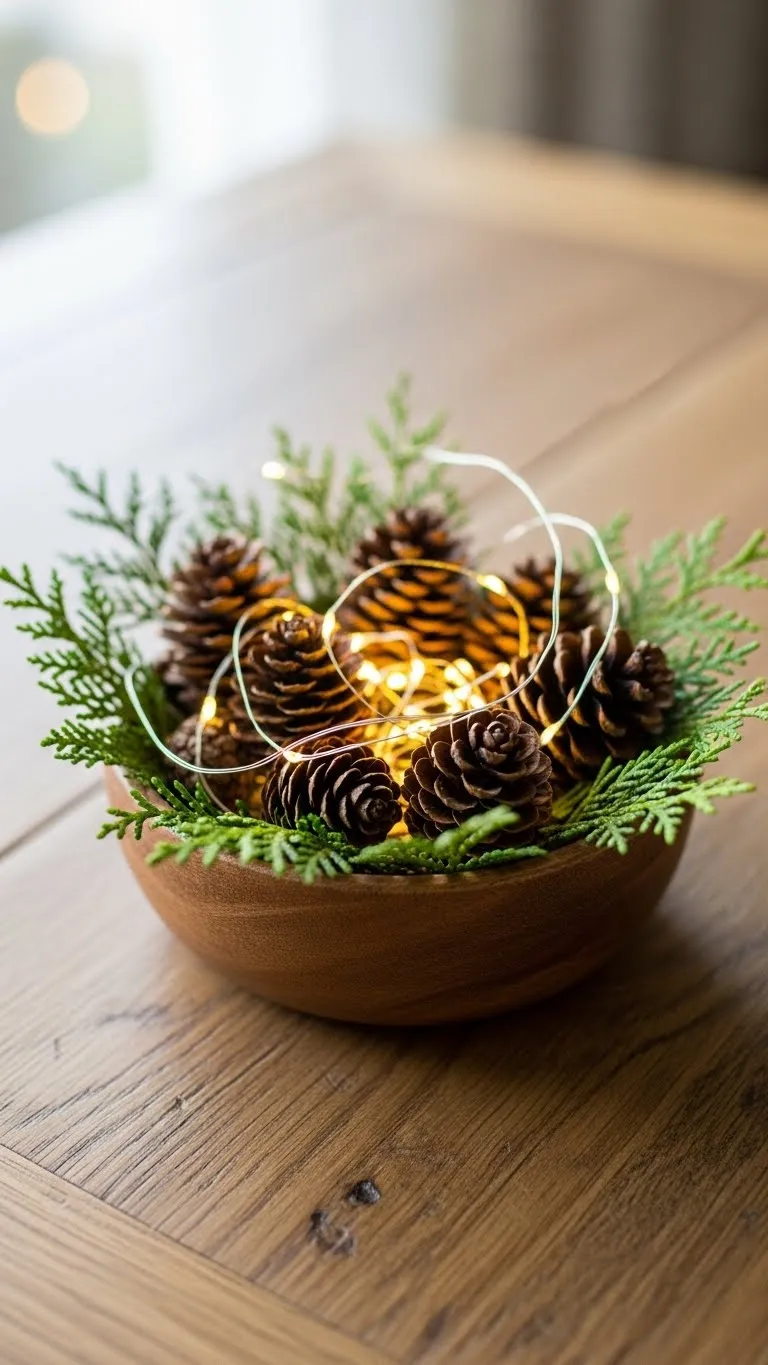 Pinecone centerpieces add natural charm. Collect pinecones from nearby parks or your yard. Place them in bowls, trays, or baskets. Add small lights for a warm glow. You can spray them lightly with white paint for a snowy look. A DIY tip is tying tiny ribbons to the tops. These centerpieces work well on tables and shelves. They cost very little and bring calm, woodsy charm to your holiday rooms.