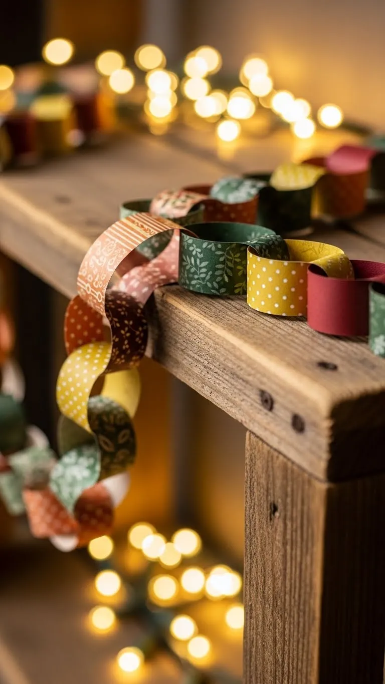 Paper chains add a simple homemade feel. Cut strips from old magazines or craft paper. Loop and glue them to form a chain. Drape the chain on mantels or tree branches. This costs almost nothing and adds color. Use muted tones for a soft, old-style look. A DIY idea is mixing patterned and solid strips. This helps the chain look more detailed. These chains bring a sweet, handmade touch to your space.