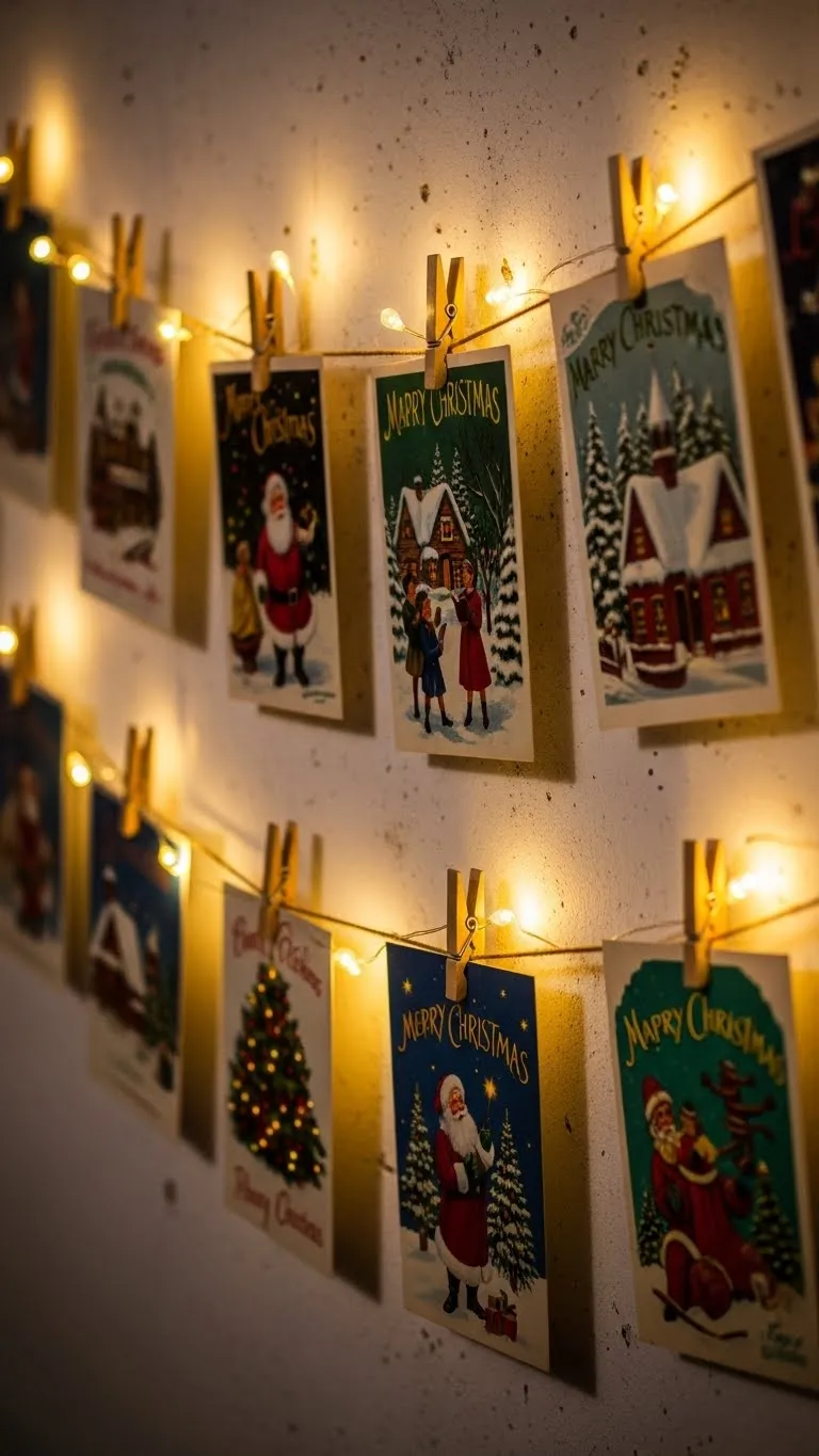 Vintage Christmas cards bring warmth with their soft colors and old prints. Hang them across a wall or place them in simple frames. You can buy bundles online or at local markets. Use clothespins and twine for a simple display. Add small pine branches to the string for texture. A DIY idea is placing cards inside a shadow box for a deeper look. These cards offer gentle holiday charm without taking much space. They also work well in narrow hallways or entry areas.