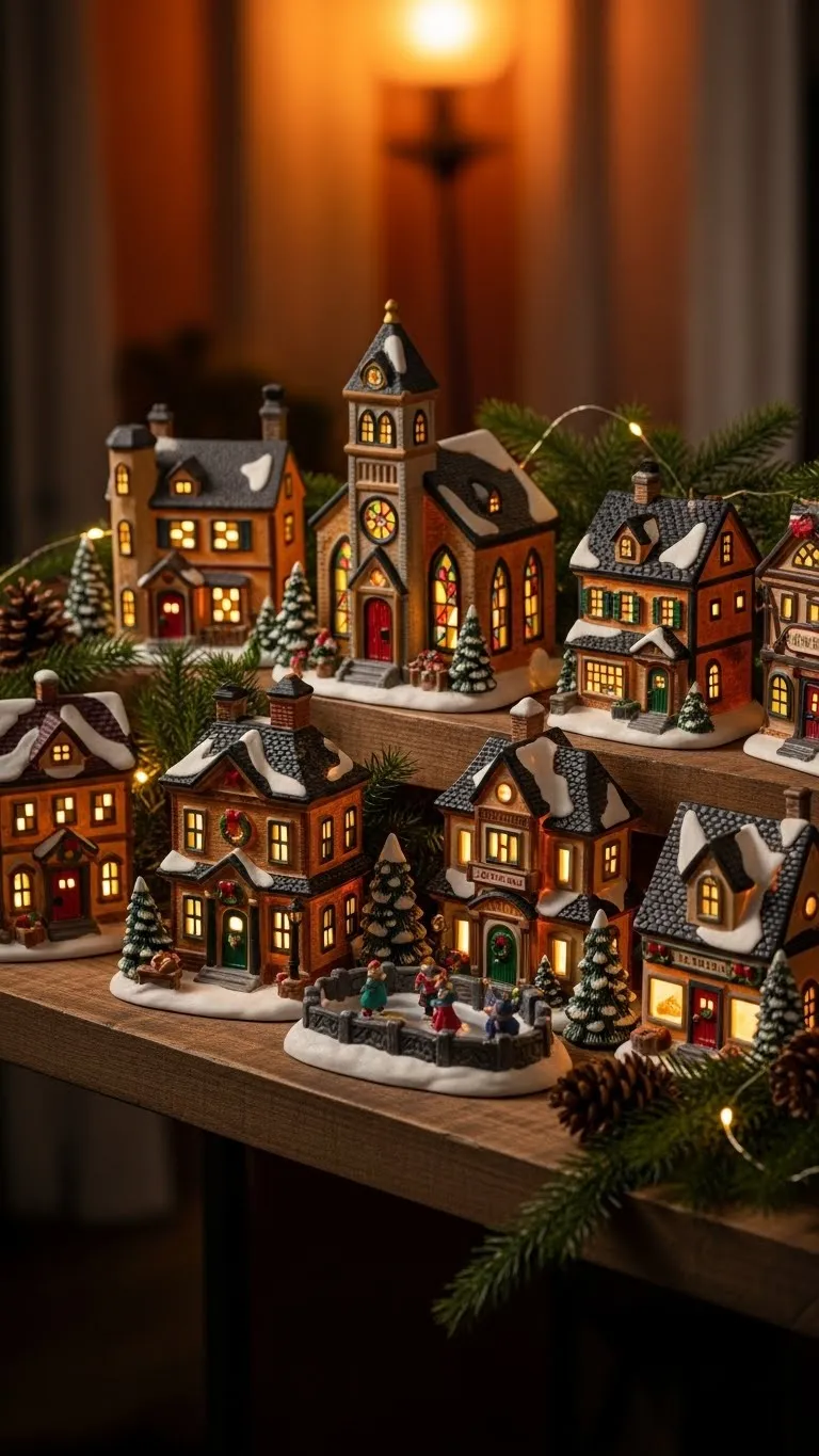 Classic ceramic villages bring a quiet holiday mood. Place them on shelves, mantels, or window sills. Their warm lights make the space feel cozy. You can find affordable pieces at thrift shops. Mix houses of different sizes for a layered look. Add cotton for a snow effect without spending much. A DIY idea is creating tiny trees with bottle brushes. Place them around the village for detail. These villages help make a calming holiday display that families enjoy. They also blend well with soft colors and warm lights.